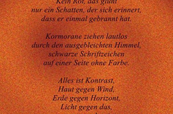 Verfremdet liegt das Rot ihrer Wangen im kalten Licht der Schwarzweißwelt. Kein Rot, das glüht nur ein Schatten, der sich erinnert, dass er einmal gebrannt hat. ~ Kormorane ziehen lautlos durch den ausgebleichten Himmel, schwarze Schriftzeichen auf…