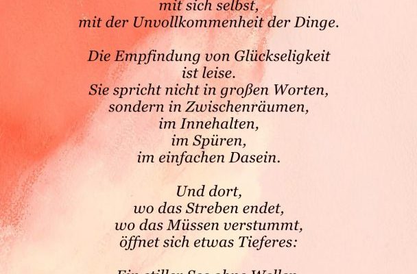 Im leisen Raum zwischen Atem und Gedanken, dort, wo die Welt nicht drängt, sondern nur ist, beginnt das Glück. ~ Glück ist kein Besitz, den man festhält, sondern ein Zustand des Loslassens. Ein Einverstanden-Sein mit dem…