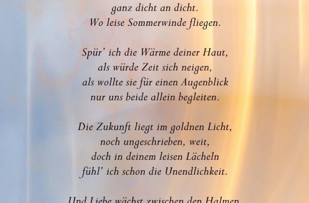 Wenn wir dann im Sonnenlicht im weichen Grase liegen, ganz dicht an dicht. Wo leise Sommerwinde fliegen. ~ Spür’ ich die Wärme deiner Haut, als würde Zeit sich neigen, als wollte sie für einen Augenblick nur…