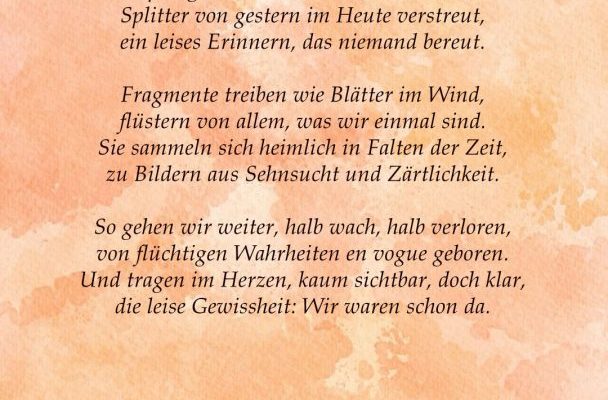 Wachträume perlen wie Tau auf der Haut, zerspringen im Blick, subtil und vertraut. Splitter von gestern im Heute verstreut, ein leises Erinnern, das niemand bereut. ~ Fragmente treiben wie Blätter im Wind, flüstern von…